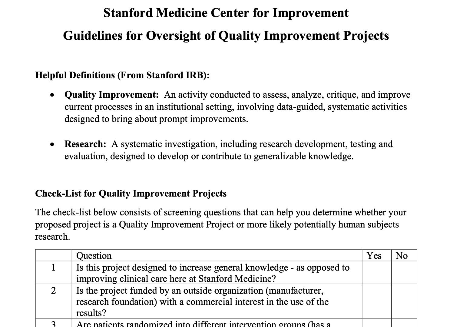 Created by the SMCI ERPG Work Group, this tool is comprised of a checklist that helps you determine if your project is considered quality improvement or human subjects research subject to IRB oversight. It also includes guidelines for those who want to publish findings of their QI projects.