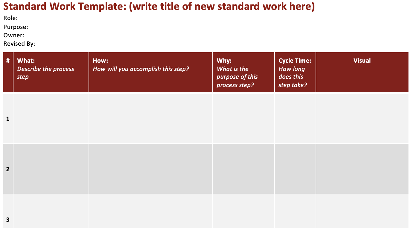 This standard work template is useful as a training tool because it outlines the key steps, how to accomplish each step, and why each step is important. The topic should be a small enough sub-set of work that it can fit in <5 steps and on one page in order to be easy to absorb.